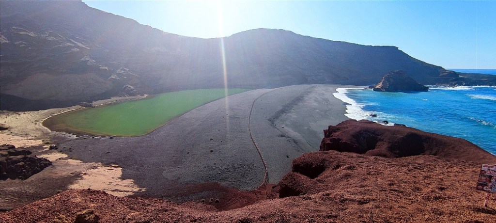 In the fishing village El Golfo, in the municipality of Yaiza, there is the Charco de los Ciclos or Charco Verde (Green Lagoon). El Charco is located in the old crater of the volcano, barely visible today and its water comes from the Atlantic Ocean. Its characteristic color is due to the mixture of sulfur with the sea water and the presence of an algae that produces chlorophyll. It is possible to observe El Charco from a viewpoint in El Golfo, and of course, it is a wonderful explosion of colors, from the emerald green color of the lagoon, the intense blue of the ocean and the sky, the reddish stone of the land and the blackish volcanic sand of the beach.
