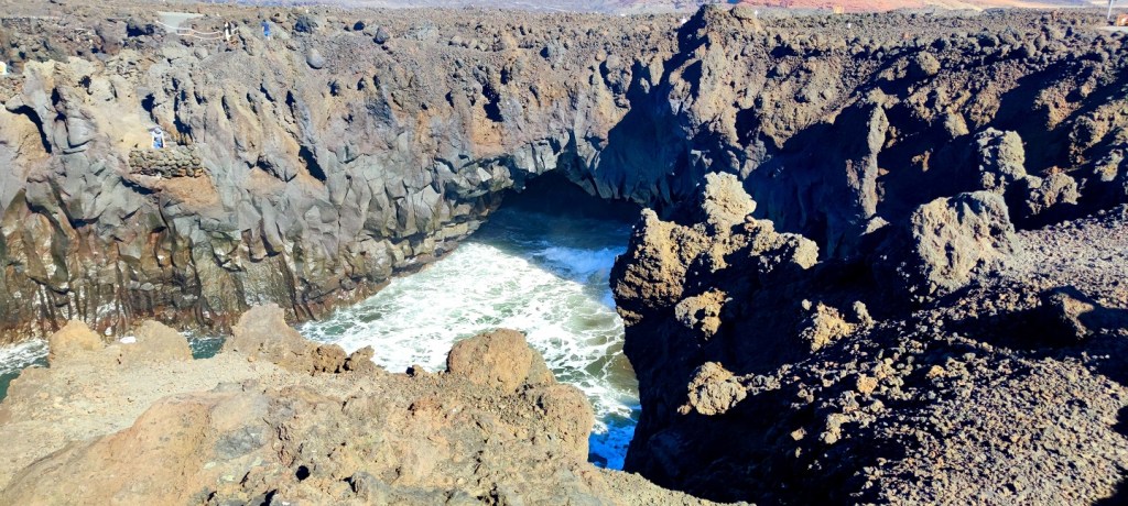 On the road to the south there is a mandatory stop at Los Hervideros. When the ocean hits hard and its waters crash against the rocks, they produce the sensation that the water is boiling, hence the name in Spanish. To visit it is free and they are only 2km from the Charco Verde, however, you have to take a detour as the road is closed due to a landslide.
