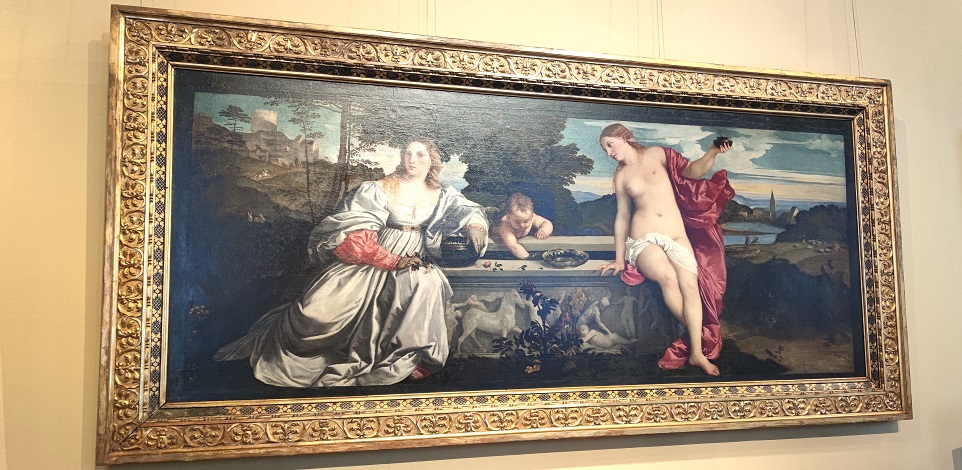 – Sacred Love and Profane Love, this title was put in the 17TH century, since previously it was called Beauty without ornamentation and Beauty adorned. In the painting two women appear seated on a fountain, but it is only one model, Violante, the artist’s young love. Among them, Cupid is playing with the water of the fountain that symbolizes life. One of the women wears a magnificent silk dress, while the other is nude, covered only by a white loin cloth and a red tunic that barely covers her left arm. Let us remember that female nudity until the end of the 19TH century was intended for mythological goddesses and represented virtues and idealism.