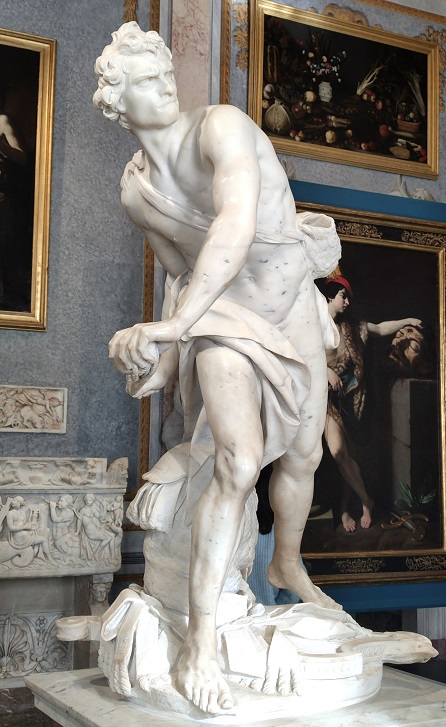 – David was one of the Old Testament characters who defeated the giant Goliath by throwing a stone with a slingshot. The body of the figure is shown at the moment when it is about to throw the stone, both feet are resting on the ground and the body is half turned. The figure is in tension; movement and power are implicit. His face shows concentration and effort, he looks very human. The impetuous gesture of the work is accentuated by the serpentine movement, with which the author demonstrates his. The representation of movement is characteristic in the Baroque.