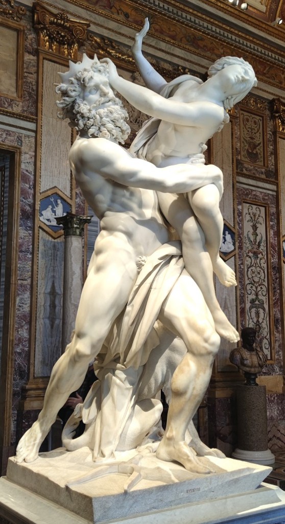 –Pulto and Prosperina is another episode of Ovid’s Metamorphoses, which explains the existence of the 4 seasons. In the spring and summer, when Proserpina returns to her mother, Ceres, the goddess of the Earth, life returns to nature. Whereas when Prosperina returns to the underworld with the god Pluto in autumn and winter, the world loses its colors and joy due to Ceres’ anguish. This work stands out above all for the texture of the marble, a hard material that here seems to be made of soft, smooth meat instead of stone. What great genius of the artist!